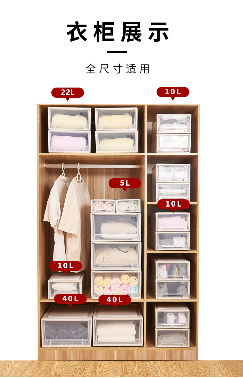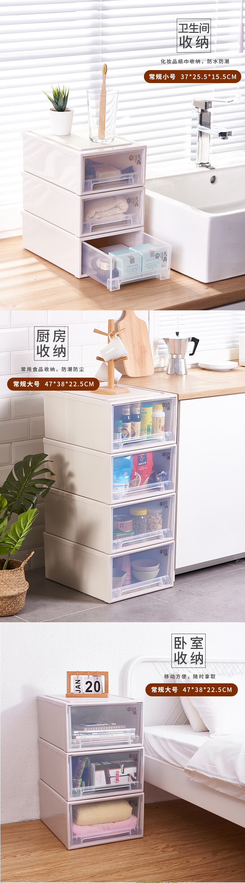 凡高(VENGO) 收纳箱 抽屉式收纳柜 40L带滑轮3个装特大号透明塑料衣物整理柜 床底储物柜